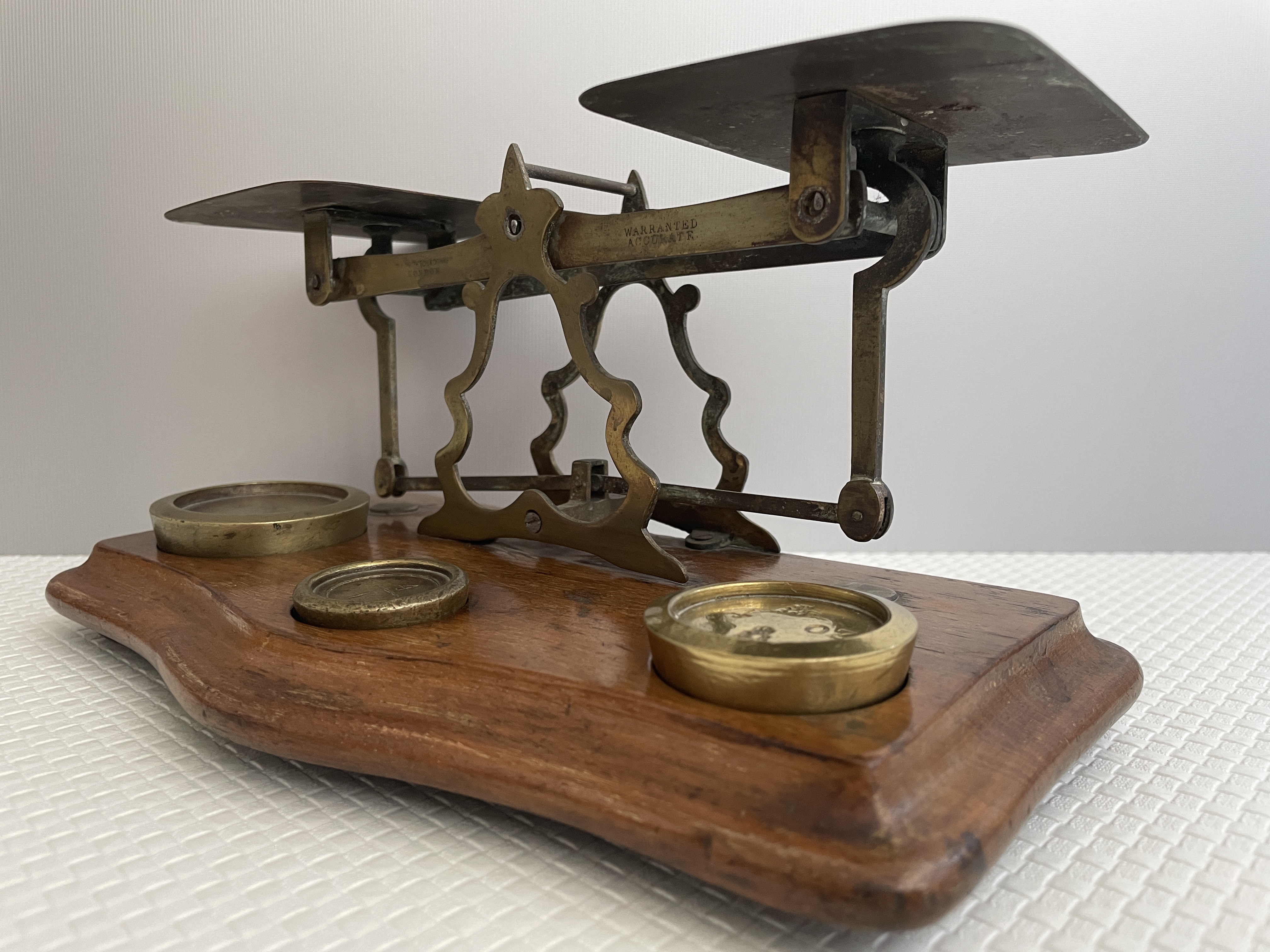 Deze weegschaal verkeerd in een originele en goed werkende staat en is compleet met drie koperen gewichtjes voor het wegen van de poststukken.